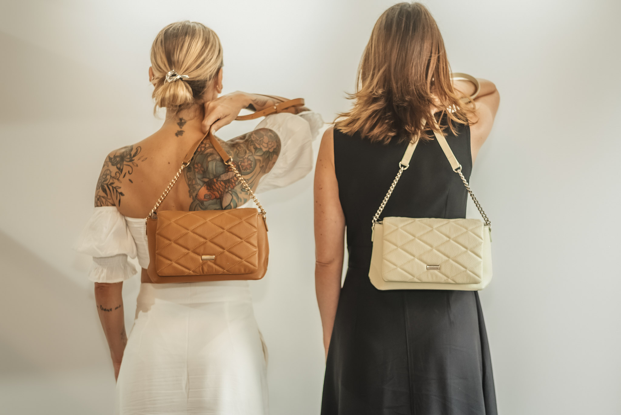 A alça tiracolo ajustável se adapta ao corpo com naturalidade, enquanto a correntaria em metal adiciona personalidade à composição. O fechamento por botão ímã garante praticidade, e os bolsos interno e externo mantêm seus itens organizados ao longo do dia.