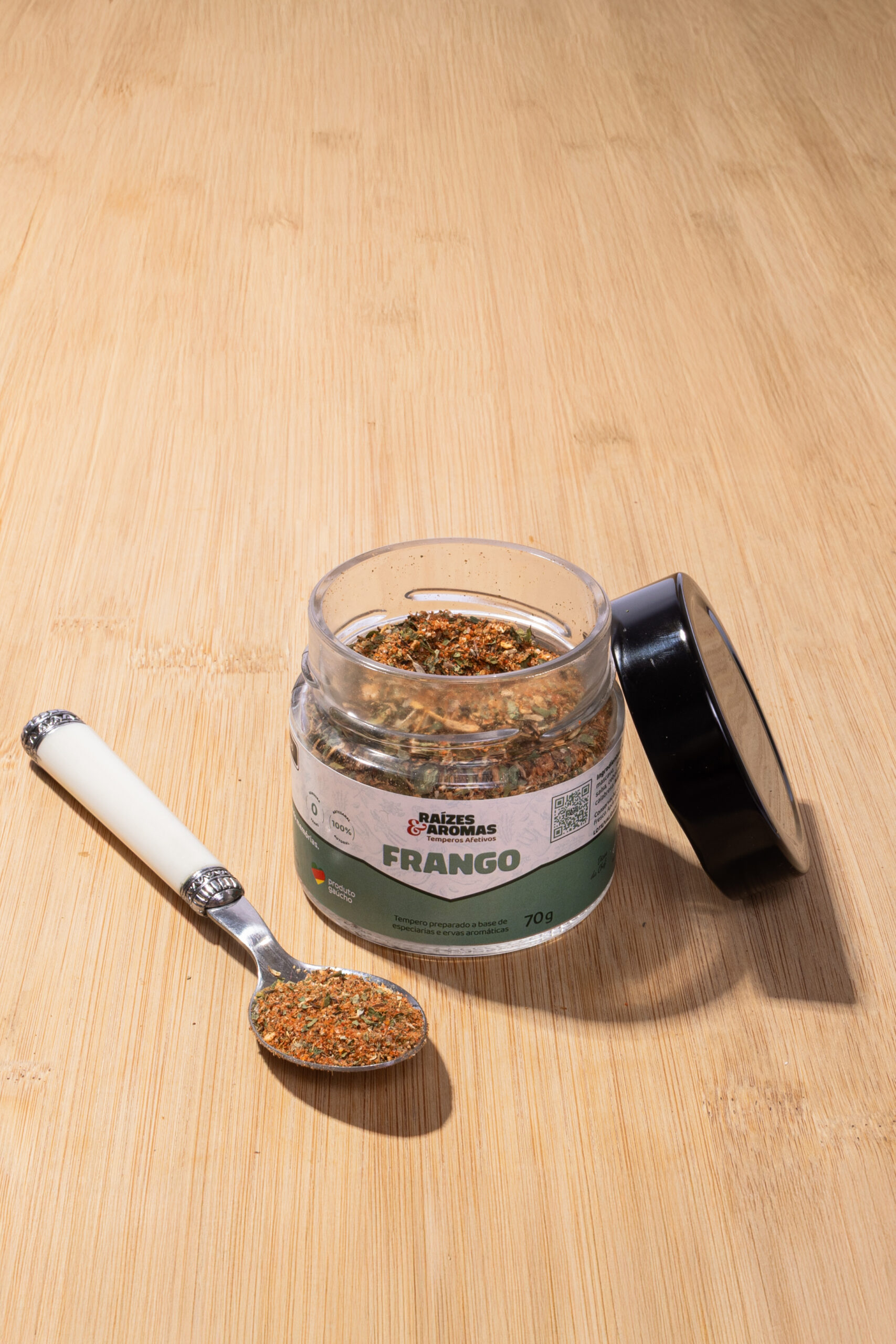 O tempero Frango foi desenvolvido para valorizar diferentes preparos com frango trazendo equilíbrio, aroma e sabor marcante na medida certa. Um blend autoral que combina sal marinho, urucum, açúcar mascavo, cebola, alho, sálvia, orégano, salsa, cebolinha, limão, tomilho e pimenta calabresa. Versátil e envolvente, proporciona carnes mais suculentas, bem temperadas e aromáticas, ideal para assados, grelhados, molhos e saladas.