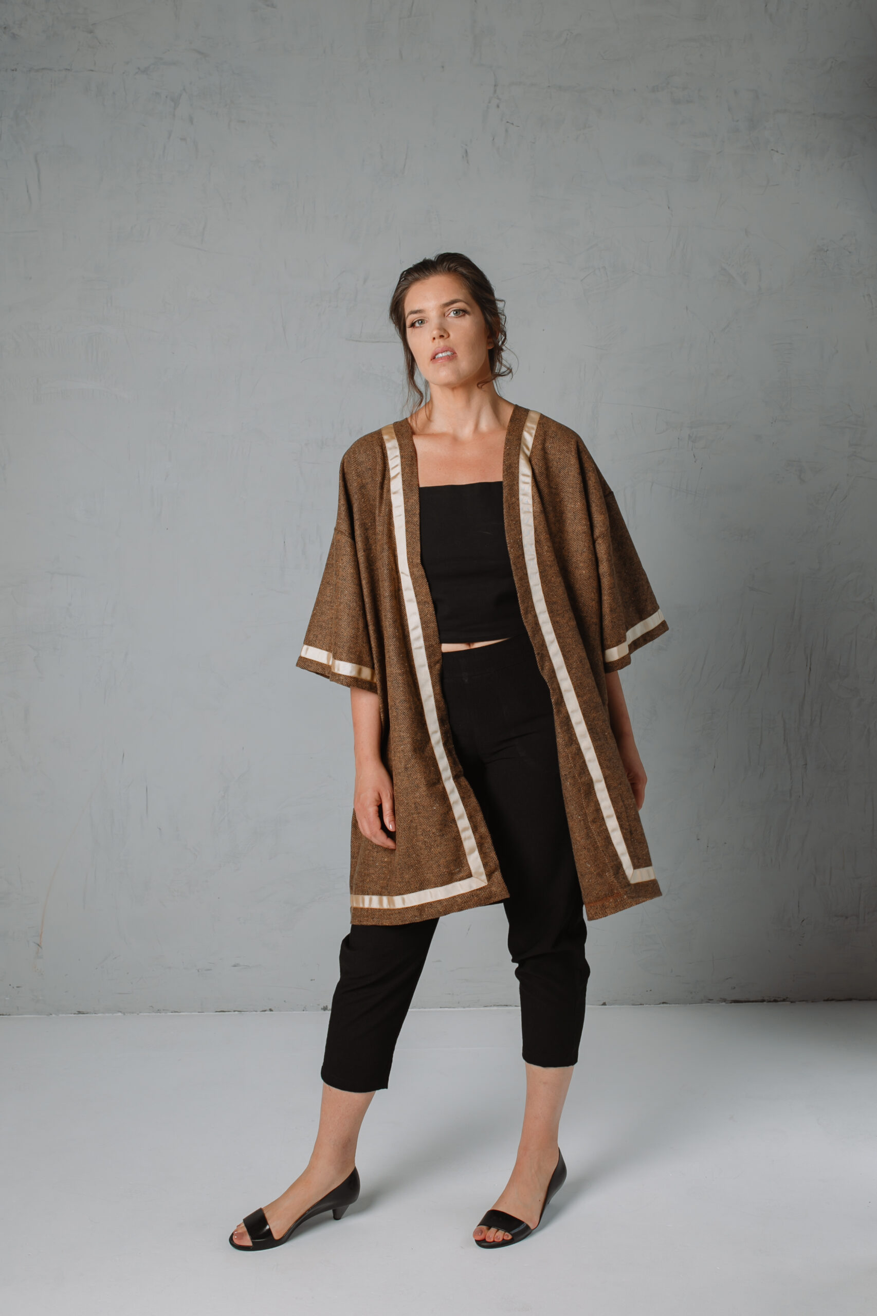 Com design contemporâneo e proposta atemporal, este quimono traz elegância descomplicada para composições versáteis. Confeccionado em tecido de lã mista, com textura levemente rústica, valoriza o aspecto natural da peça, enquanto o acabamento em gorgurão dourado, contrasta adicionando sofisticação e um toque de destaque sutil. Sua modelagem alongada com mangas soltas e caimento fluido, proporciona conforto e movimento, tornando-o ideal para sobreposições que transitam do casual ao sofisticado com facilidade. Perfeito para elevar produções básicas, o quimono combina com diferentes estilos e ocasiões, sendo uma peça-chave no guarda-roupa cotidiano.