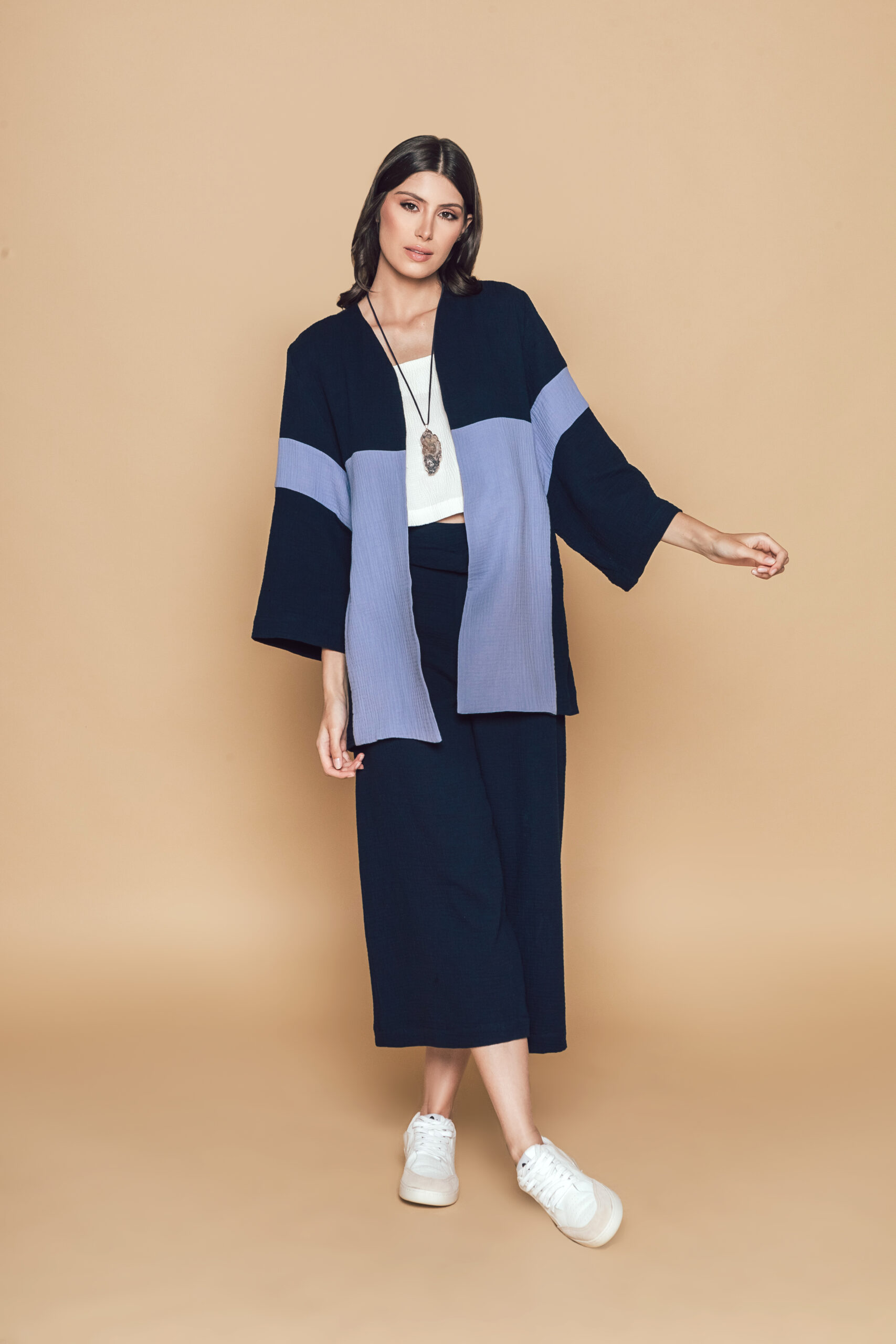 O Kimono Rotas auxilia o teu ser ao encontro da sua essência. Com recortes em dois tons em gaze, nos conectam com a fonte. Modelagem ampla e fluída. Peça que pode compor com a Calça Feixe e a Calça Sincronia.
