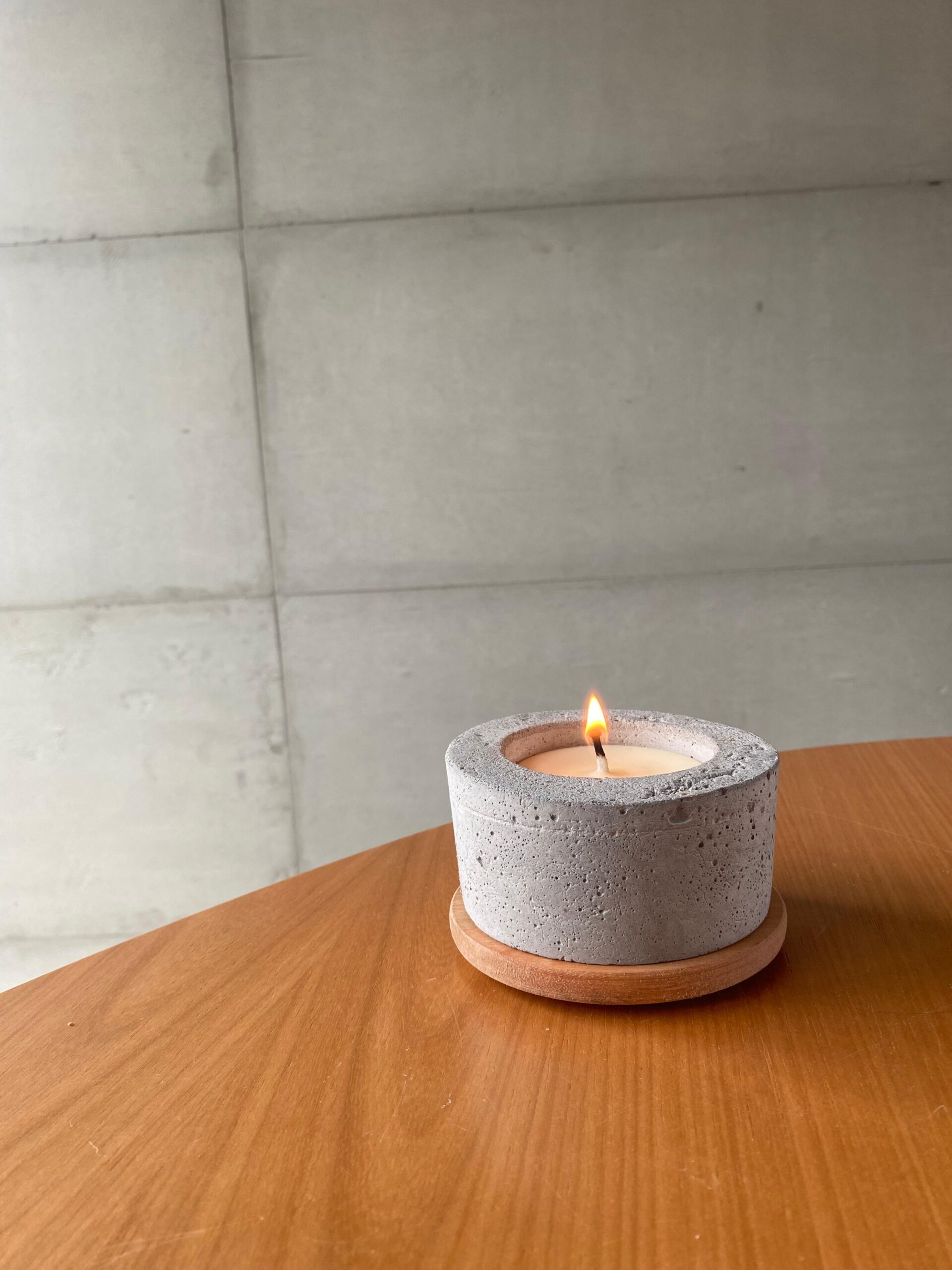 Vela aromática produzida em concreto cinza, cera de coco e pavio de algodão, garantindo uma queima mais limpa e lenta. A tampa de madeira protege da luminosidade, calor e sujeira (e também indicada para apagar a chama da vela). Após toda queima da cera, o suporte pode ser usado como porta objetos ou cachepô para plantas. Dimensões: altura: 5cm/diâm.: 8cm (95g)