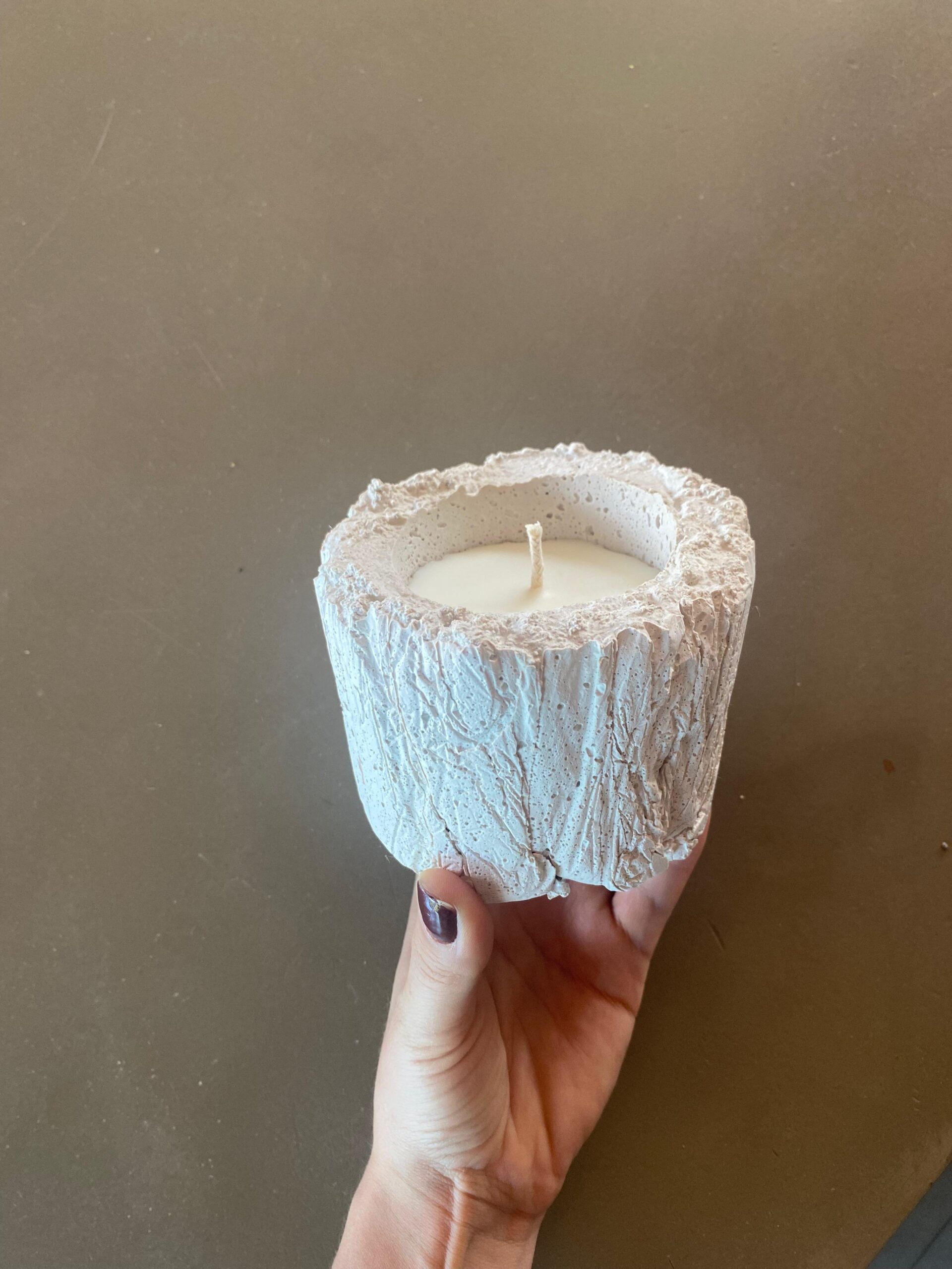 Vela aromática produzida com cera de coco, pavio de algodão e concreto branco (com reuzo de sacolas plásticas para este efeito de textura). Cada peça tem um resultado único e especial.