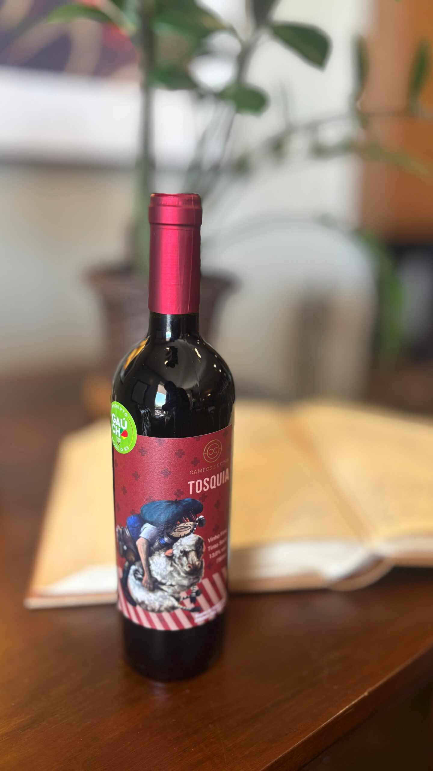 Atividade muito comum na região da fronteira, tosquia é o ato de cortar a lã rente ao corpo do animal, especialmente ovinos. Estes também presentes na propriedade familiar onde estão os vinhedos da Vinícola. Desenvolvido em parceria com o artista Felipe Constant, o rótulo do vinho retrata esta atividade.